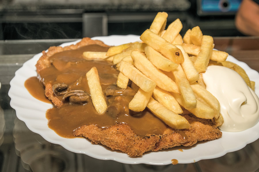 Eine große Auswahl an Pfannenschnitzeln, wahlweise mit Sauce oder überbacken, steht ebenso auf der Speisekarte wie Frikadellen, Koteletts oder Sülze.